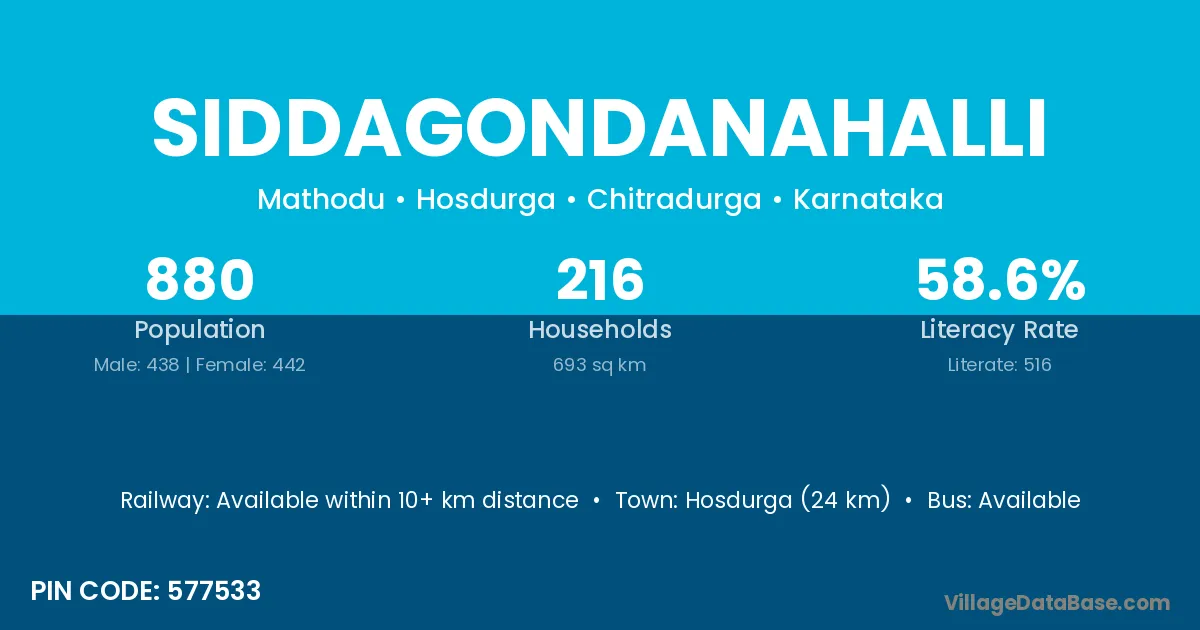 Hosdurga (24 km) is the nearest town to Siddagondanahalli village for major economic activities and is located approximately 24 km away.