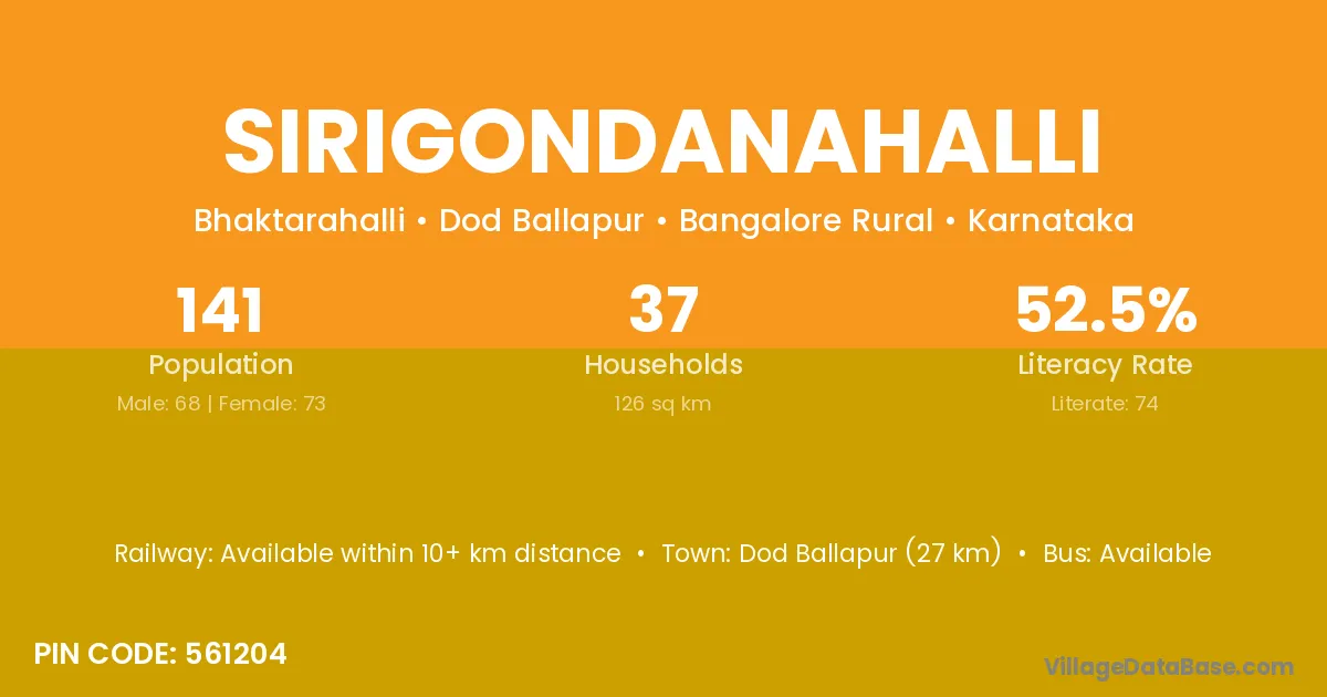 Hosdurga (21 km) is the nearest town to Sirigondanahalli village for major economic activities and is located approximately 21 km away.
