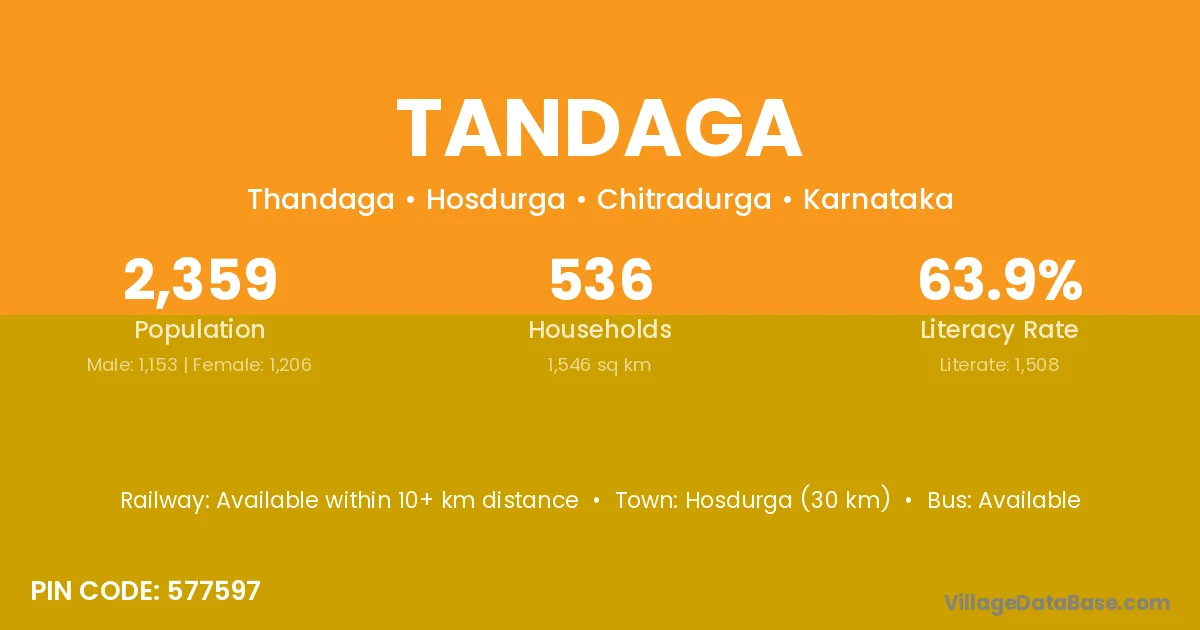 Hosdurga (30 km) is the nearest town to Tandaga village for major economic activities and is located approximately 30 km away.