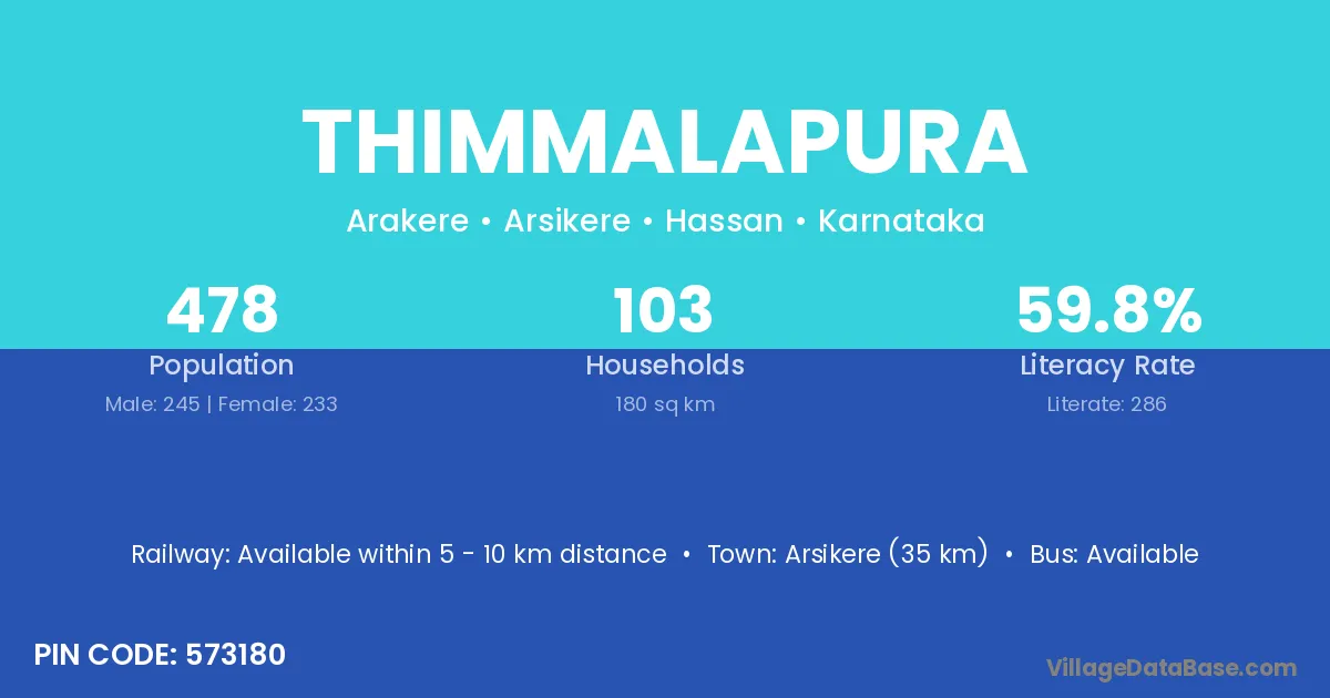 Hosdurga (20 km) is the nearest town to Thimmalapura village for major economic activities and is located approximately 20 km away.