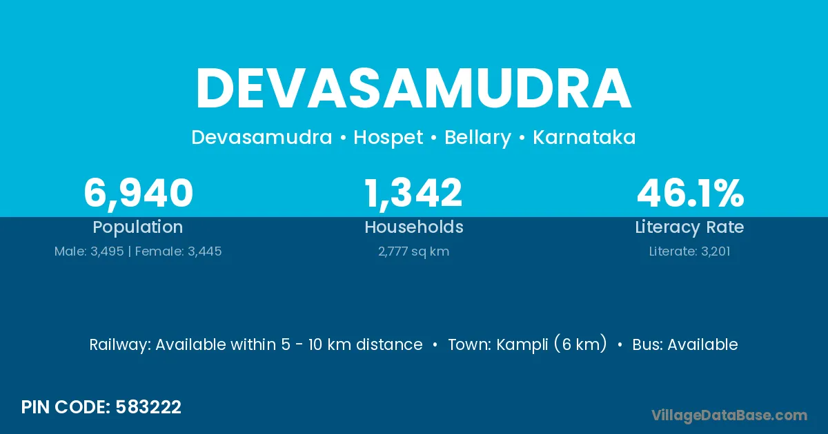 Molakalmuru (30 km) is the nearest town to Devasamudra village for major economic activities and is located approximately 30 km away.