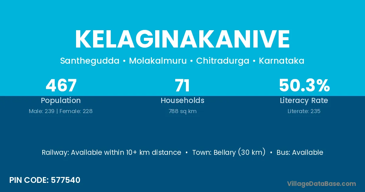 Bellary (30 km) is the nearest town to Kelaginakanive village for major economic activities and is located approximately 30 km away.