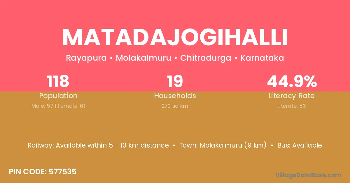 Matadajogihalli village has a total population of 118 people, of which 57 are males and 61 are females.