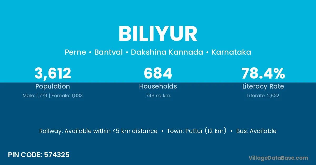 Puttur (12 km) is the nearest town to Biliyur village for major economic activities and is located approximately 12 km away.