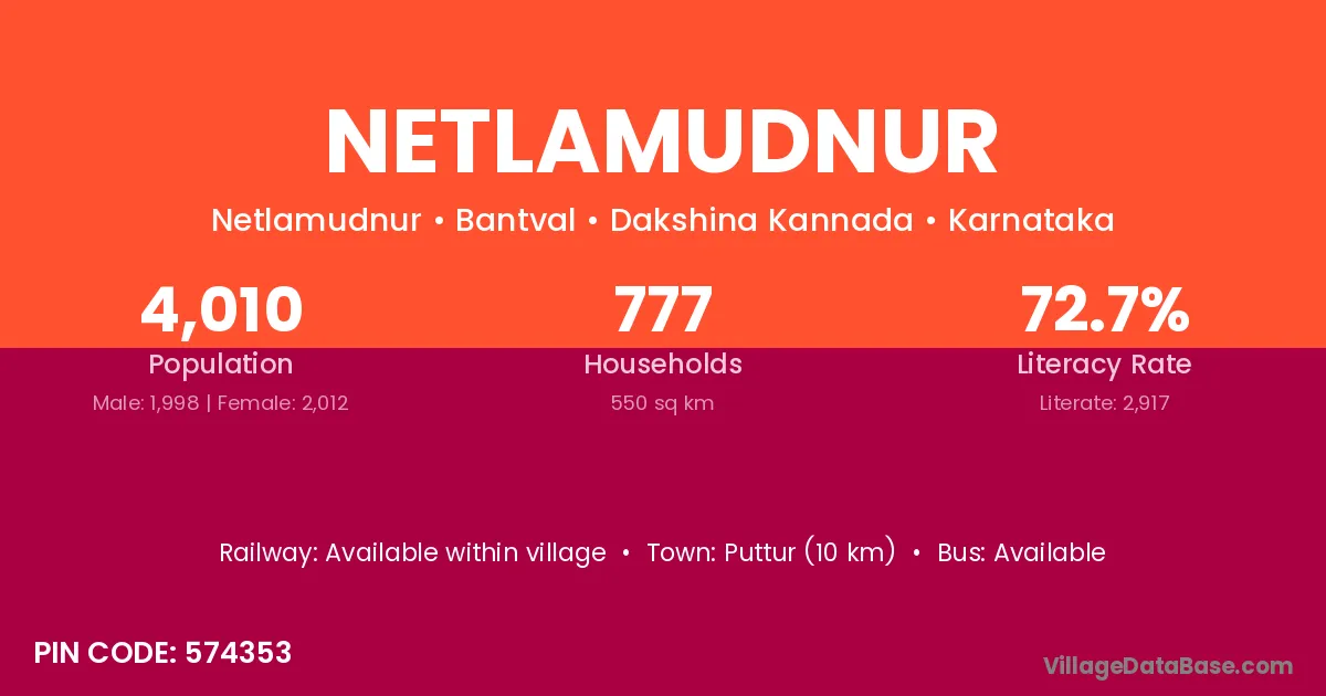 Netlamudnur village has a total population of 4,010 people, of which 1,998 are males and 2,012 are females.