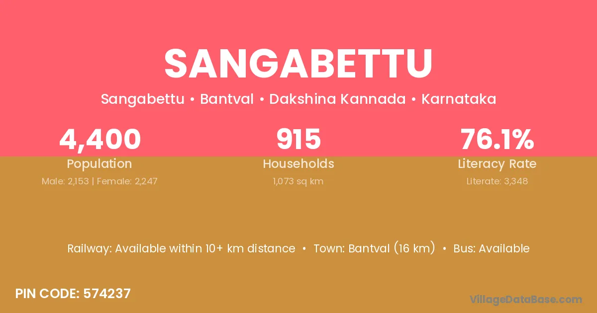 Bantval (16 km) is the nearest town to Sangabettu village for major economic activities and is located approximately 16 km away.
