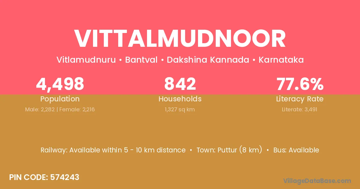Puttur (8 km) is the nearest town to Vittalmudnoor village for major economic activities and is located approximately 8 km away.