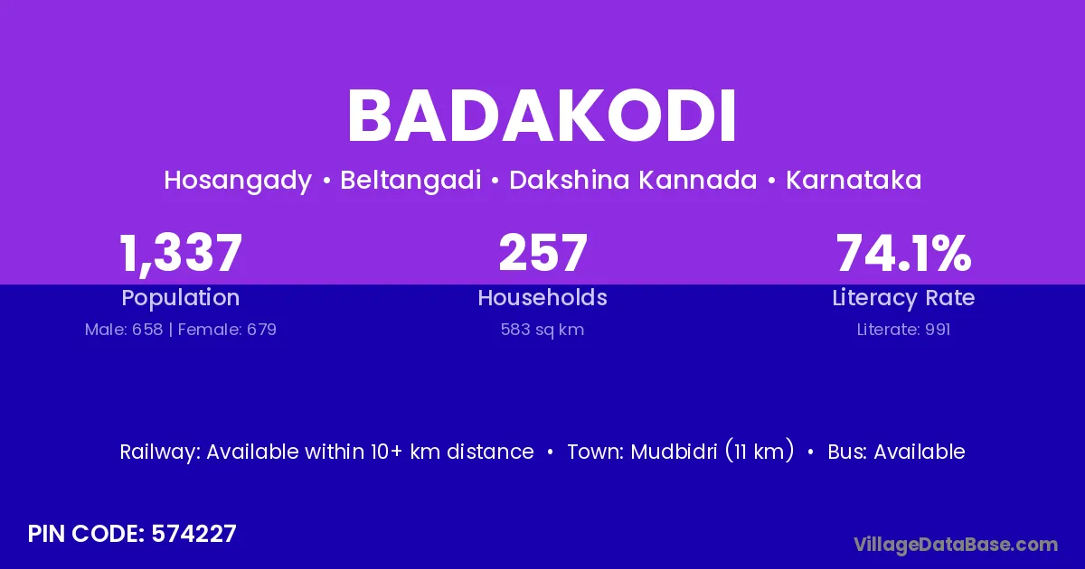 Mudbidri (11 km) is the nearest town to Badakodi village for major economic activities and is located approximately 11 km away.