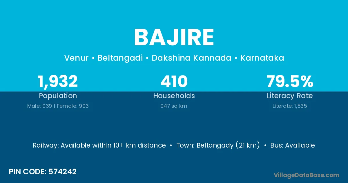 Beltangady (21 km) is the nearest town to Bajire village for major economic activities and is located approximately 21 km away.