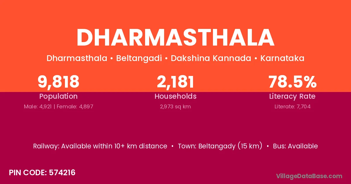 Dharmasthala village has a total population of 9,818 people, of which 4,921 are males and 4,897 are females.