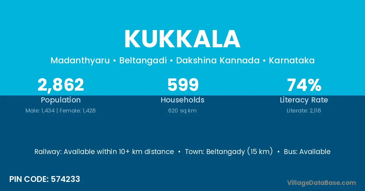 Beltangady (15 km) is the nearest town to Kukkala village for major economic activities and is located approximately 15 km away.