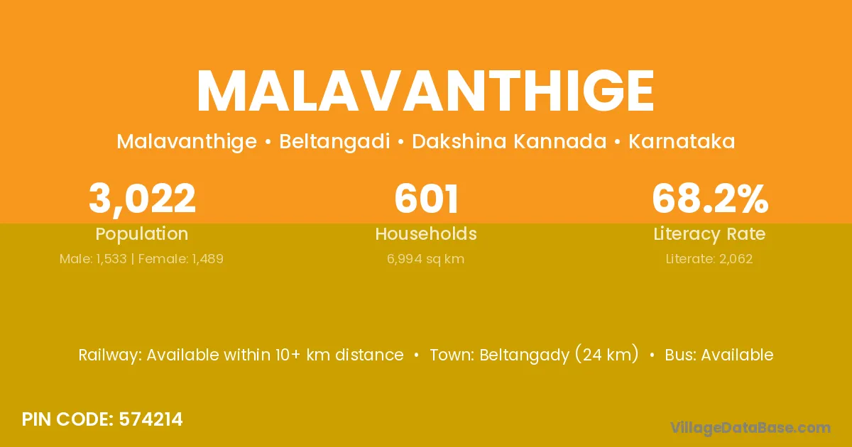 Beltangady (24 km) is the nearest town to Malavanthige village for major economic activities and is located approximately 24 km away.