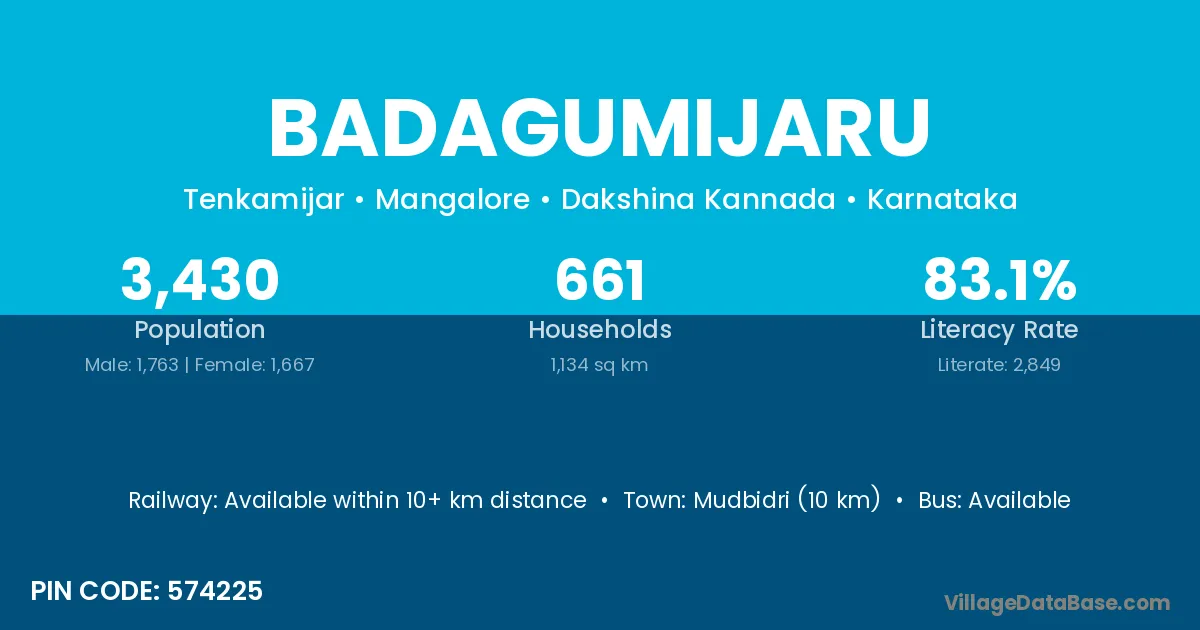 Mudbidri (10 km) is the nearest town to Badagumijaru village for major economic activities and is located approximately 10 km away.