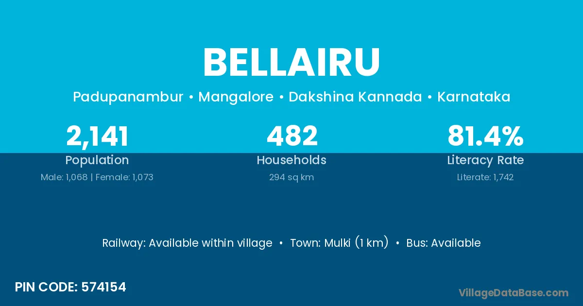Mulki (1 km) is the nearest town to Bellairu village for major economic activities and is located approximately 1 km away.