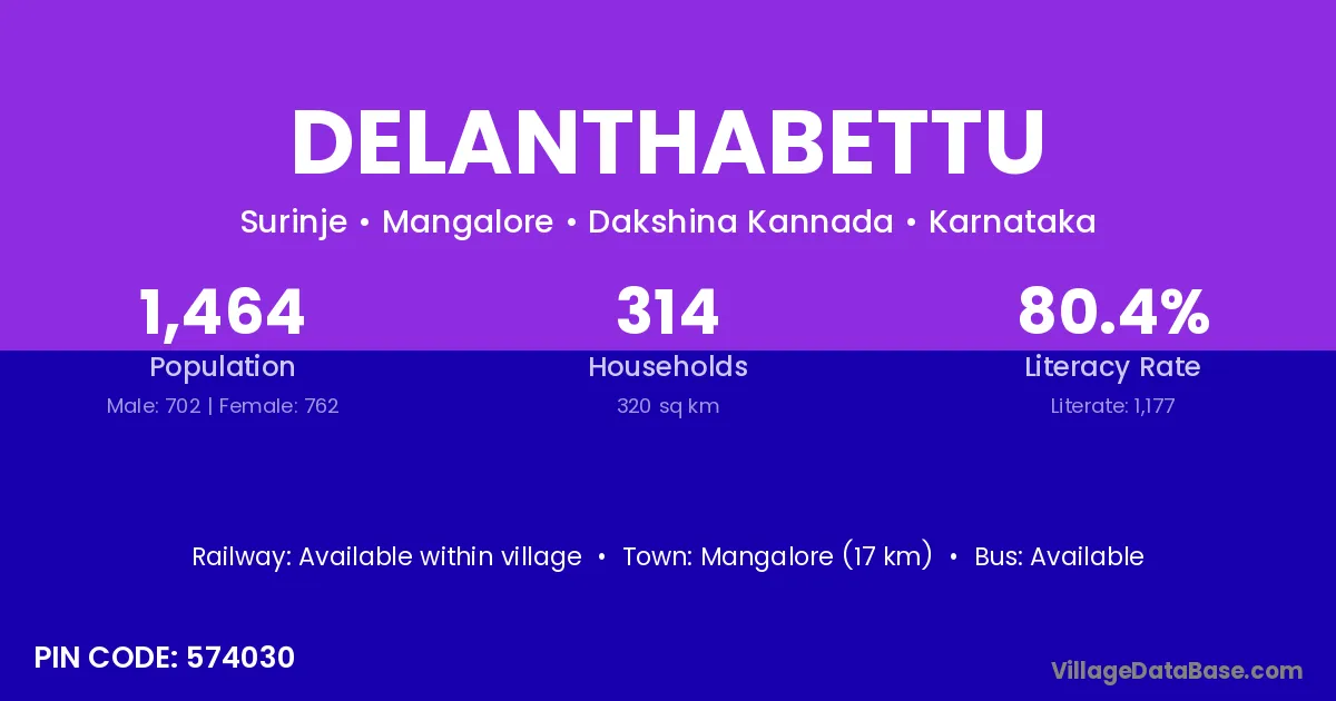 Delanthabettu village has a total population of 1,464 people, of which 702 are males and 762 are females.