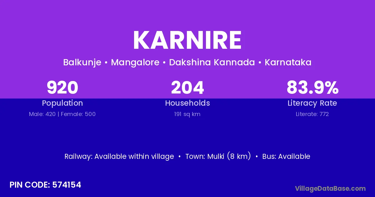 Mulki (8 km) is the nearest town to Karnire village for major economic activities and is located approximately 8 km away.