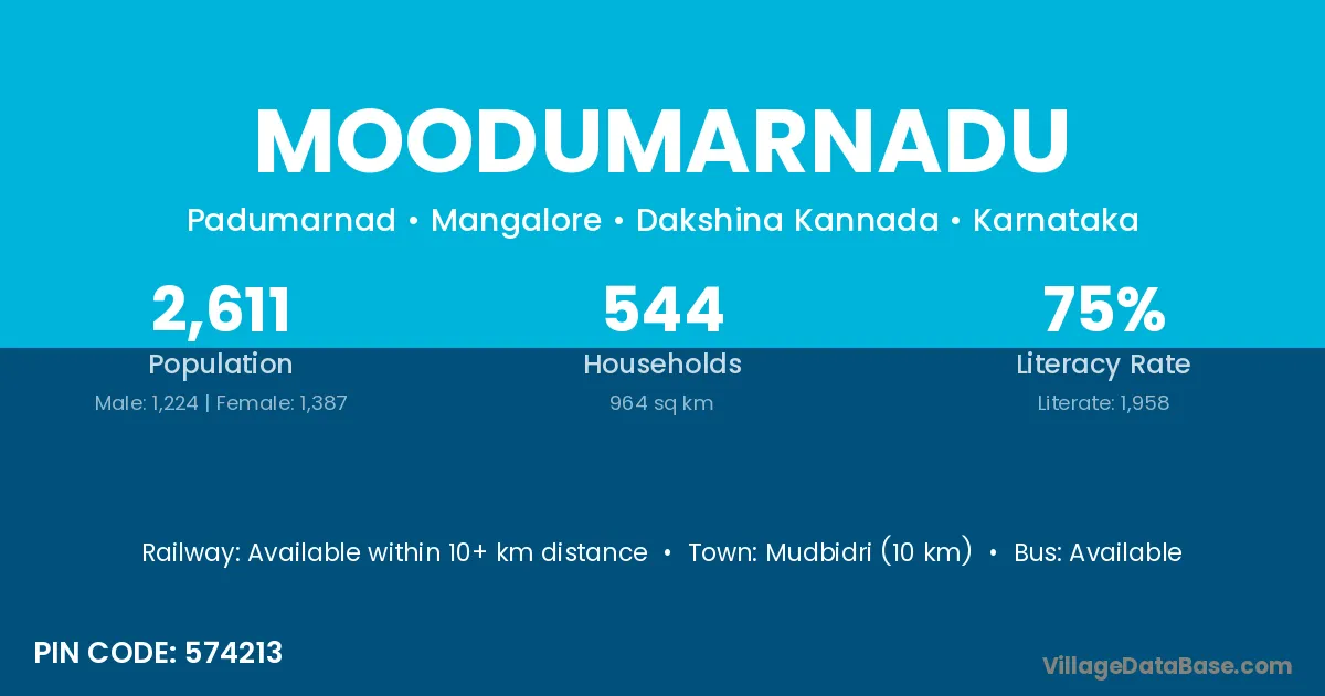 Mudbidri (10 km) is the nearest town to Moodumarnadu village for major economic activities and is located approximately 10 km away.