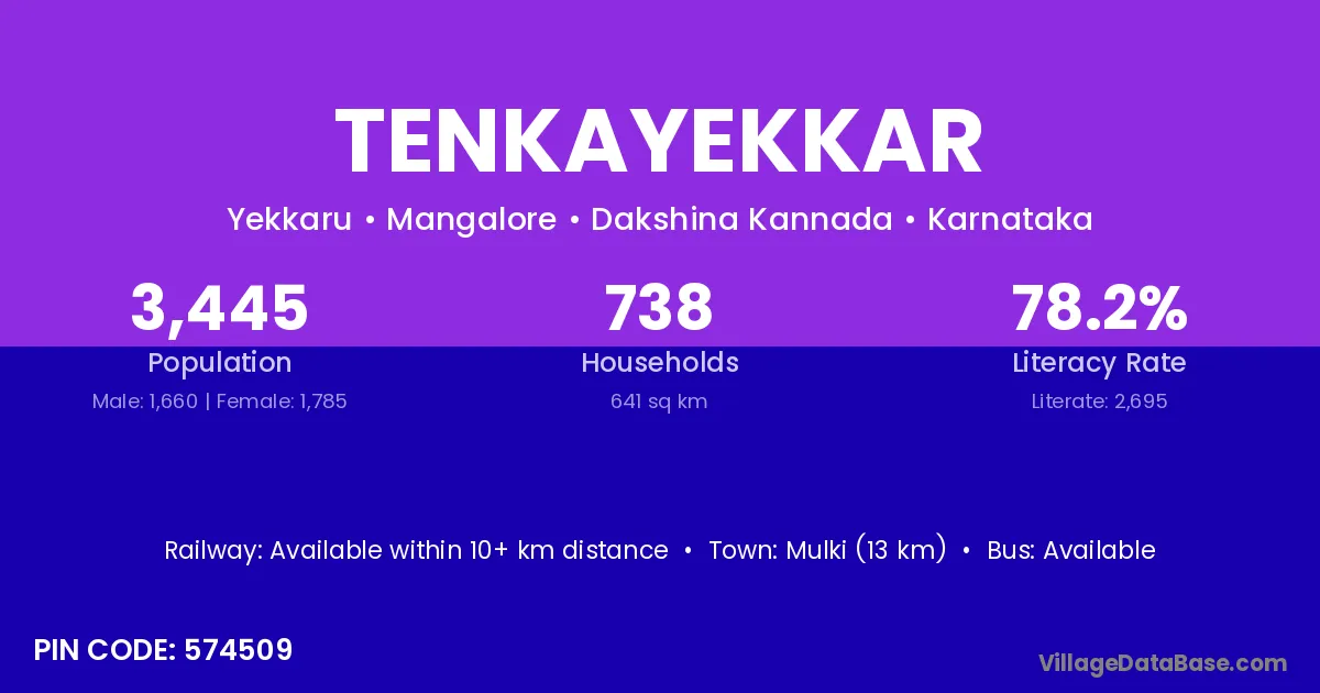 Mulki (13 km) is the nearest town to Tenkayekkar village for major economic activities and is located approximately 13 km away.