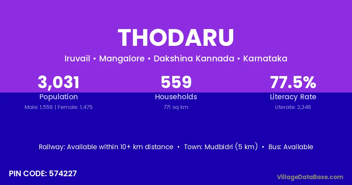 Mudbidri (5 km) is the nearest town to Thodaru village for major economic activities and is located approximately 5 km away.