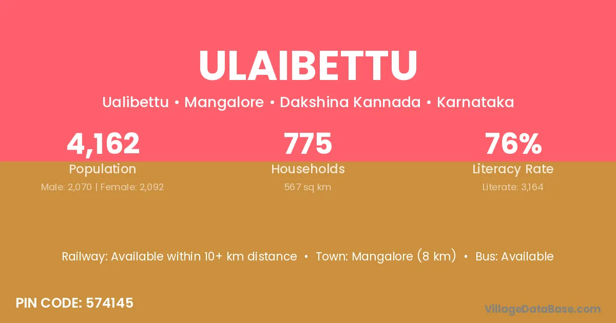 Mangalore (8 km) is the nearest town to Ulaibettu village for major economic activities and is located approximately 8 km away.