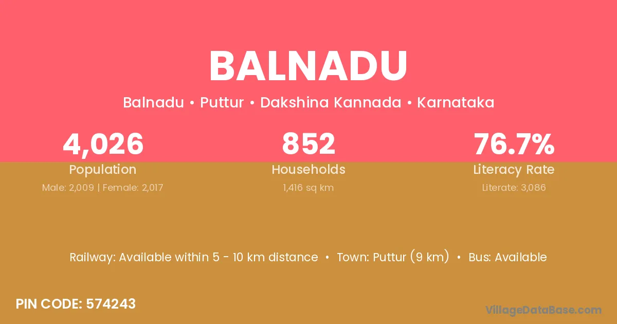Puttur (9 km) is the nearest town to Balnadu village for major economic activities and is located approximately 9 km away.