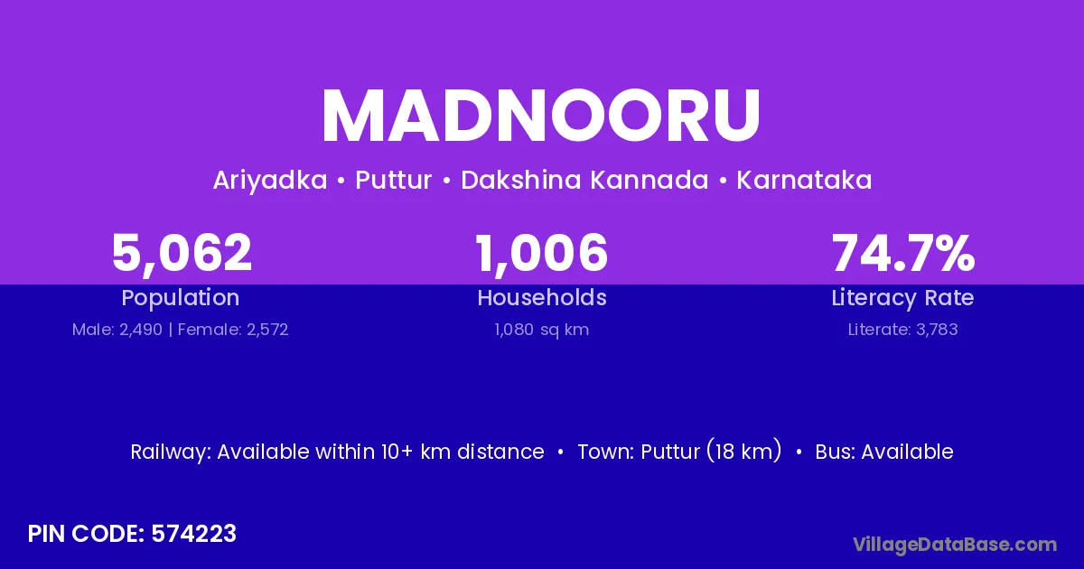 Puttur (18 km) is the nearest town to Madnooru village for major economic activities and is located approximately 18 km away.