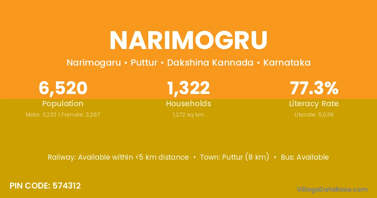 Puttur (8 km) is the nearest town to Narimogru village for major economic activities and is located approximately 8 km away.