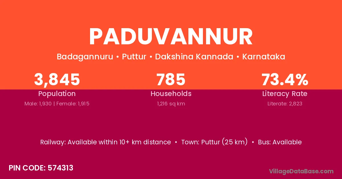 Puttur (25 km) is the nearest town to Paduvannur village for major economic activities and is located approximately 25 km away.