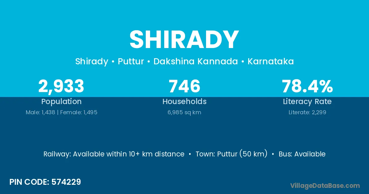 Puttur (50 km) is the nearest town to Shirady village for major economic activities and is located approximately 50 km away.