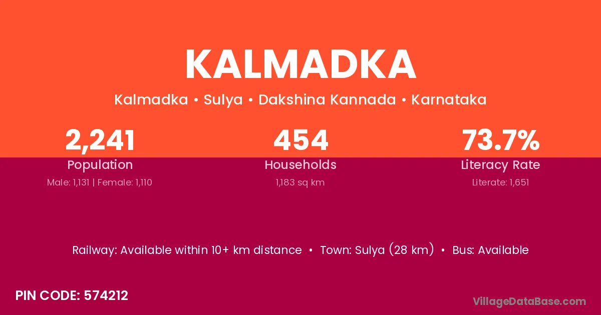 Sulya (28 km) is the nearest town to Kalmadka village for major economic activities and is located approximately 28 km away.