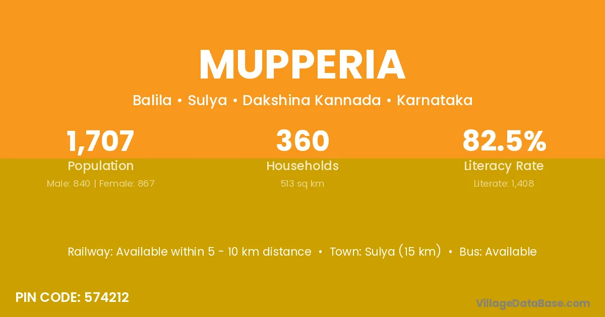 Sulya (15 km) is the nearest town to Mupperia village for major economic activities and is located approximately 15 km away.
