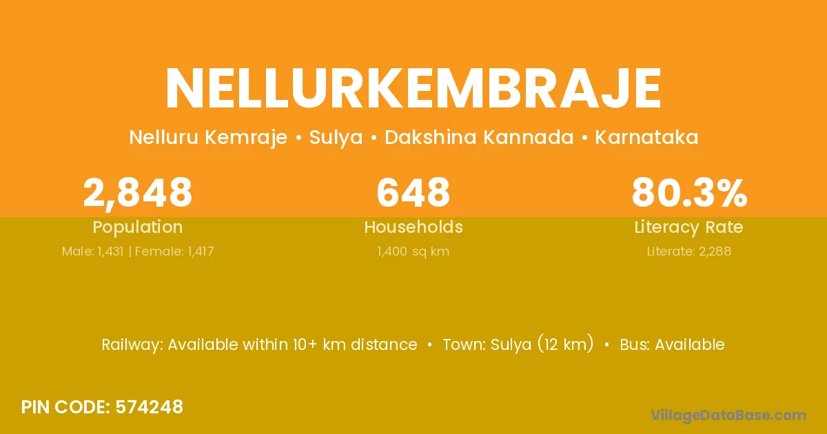 Sulya (12 km) is the nearest town to Nellurkembraje village for major economic activities and is located approximately 12 km away.