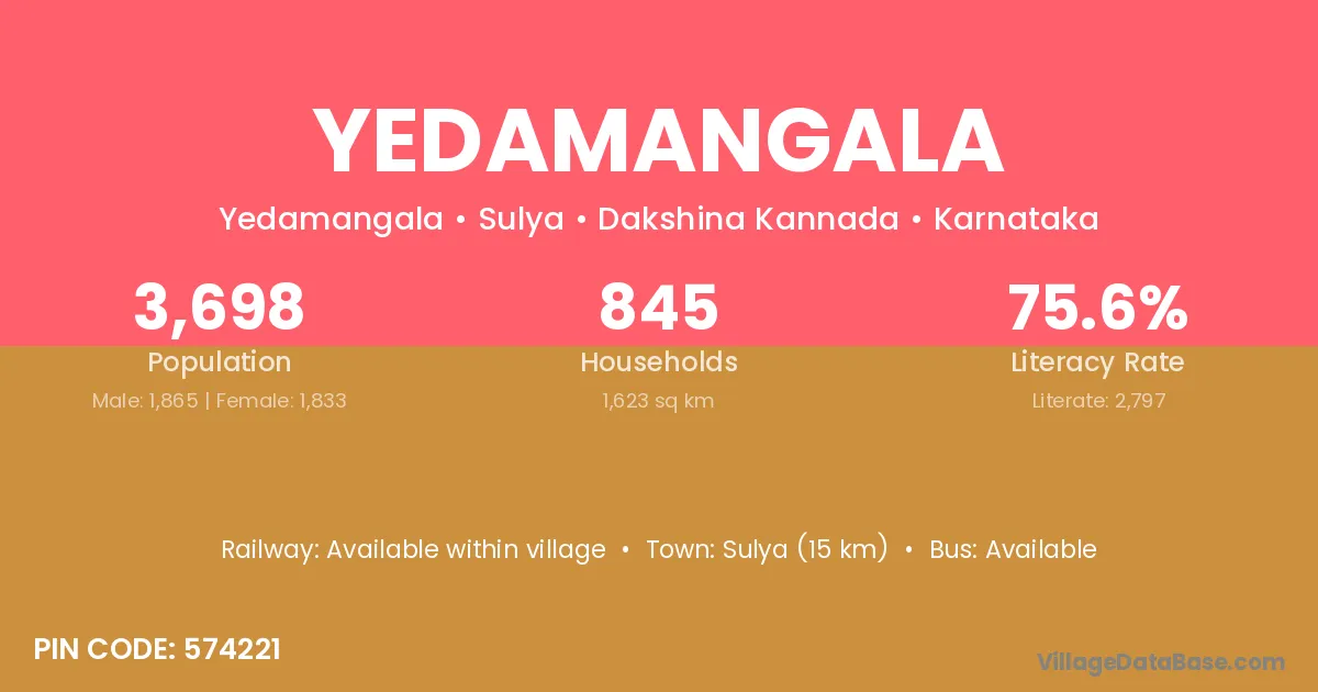 Sulya (15 km) is the nearest town to Yedamangala village for major economic activities and is located approximately 15 km away.