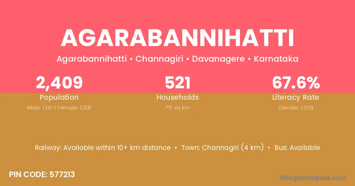 Agarabannihatti village has a total population of 2,409 people, of which 1,191 are males and 1,218 are females.