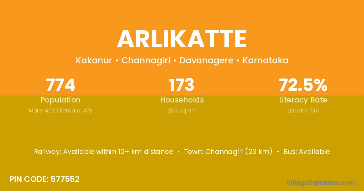 Arlikatte village has a total population of 774 people, of which 402 are males and 372 are females.