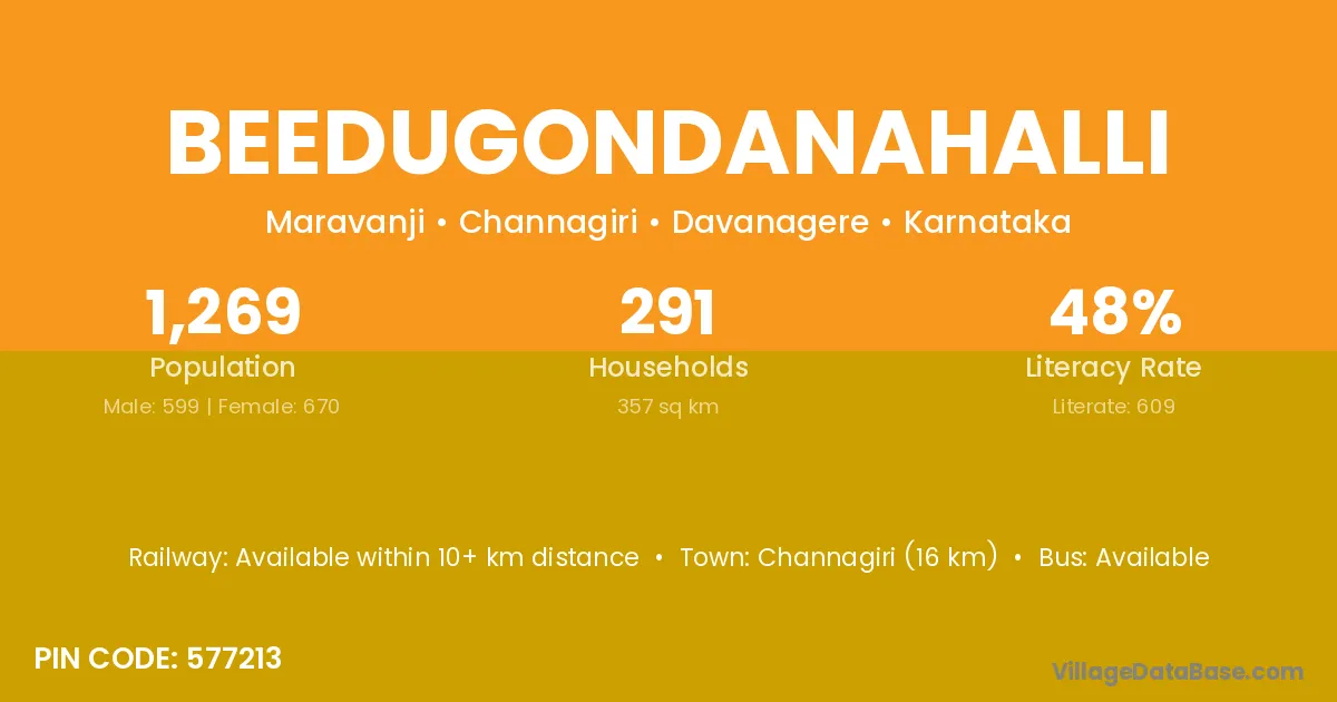Beedugondanahalli village has a total population of 1,269 people, of which 599 are males and 670 are females.