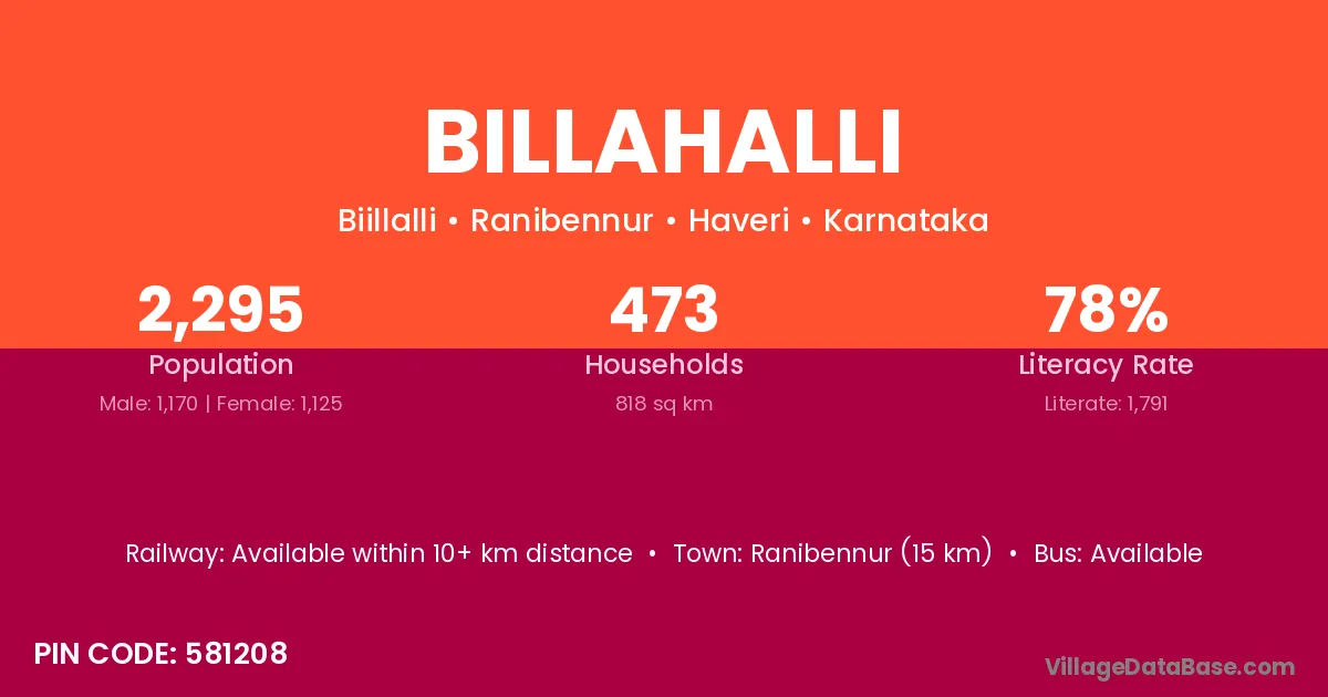 The literacy rate of Billahalli village is 72.67%. Male literacy stands at 76.39% and female literacy at 68.90%.