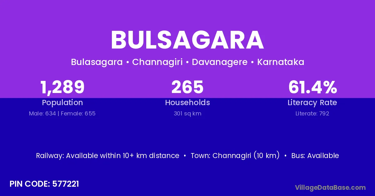 Channagiri (10 km) is the nearest town to Bulsagara village for major economic activities and is located approximately 10 km away.