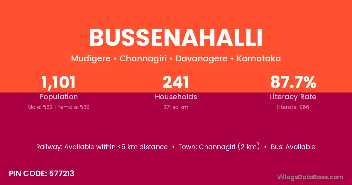 Channagiri (2 km) is the nearest town to Bussenahalli village for major economic activities and is located approximately 2 km away.