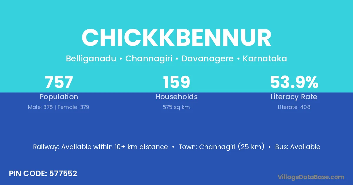 Chickkbennur village has a total population of 757 people, of which 378 are males and 379 are females.