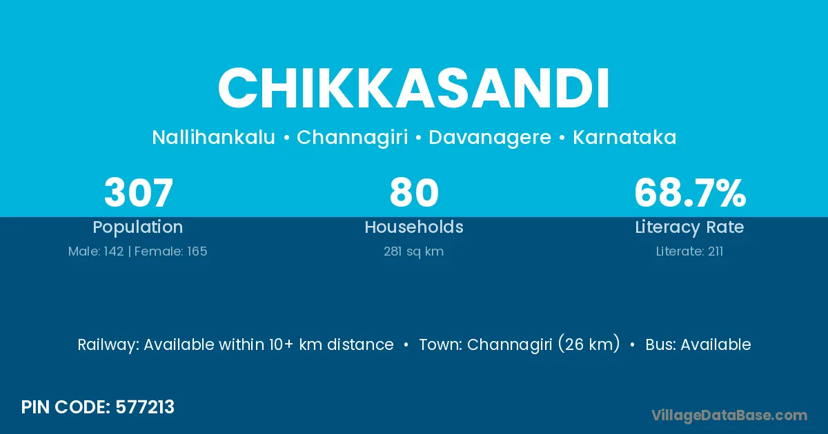 Channagiri (26 km) is the nearest town to Chikkasandi village for major economic activities and is located approximately 26 km away.