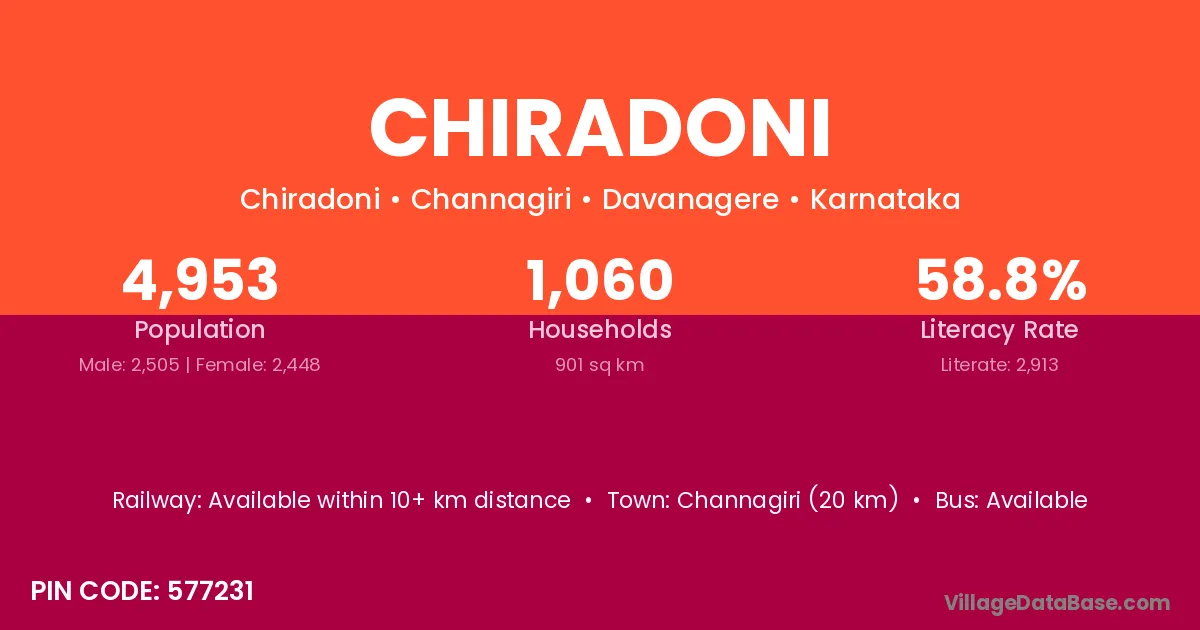 Channagiri (20 km) is the nearest town to Chiradoni village for major economic activities and is located approximately 20 km away.