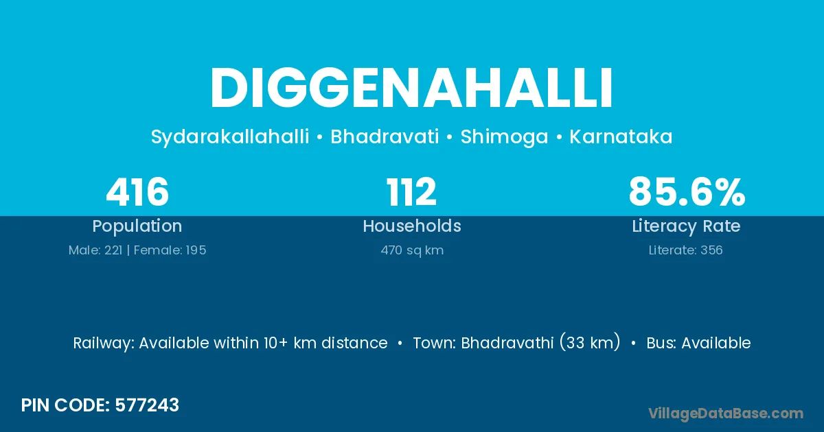 Channagiri (1 km) is the nearest town to Diggenahalli village for major economic activities and is located approximately 1 km away.