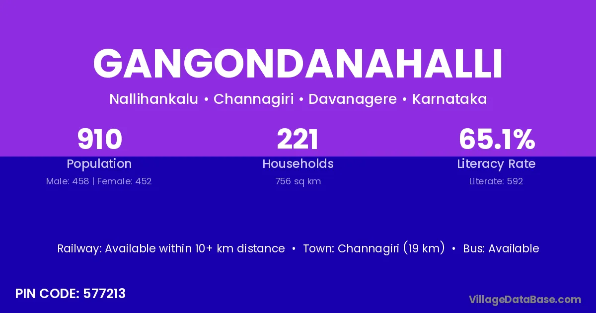 Channagiri (19 km) is the nearest town to Gangondanahalli village for major economic activities and is located approximately 19 km away.