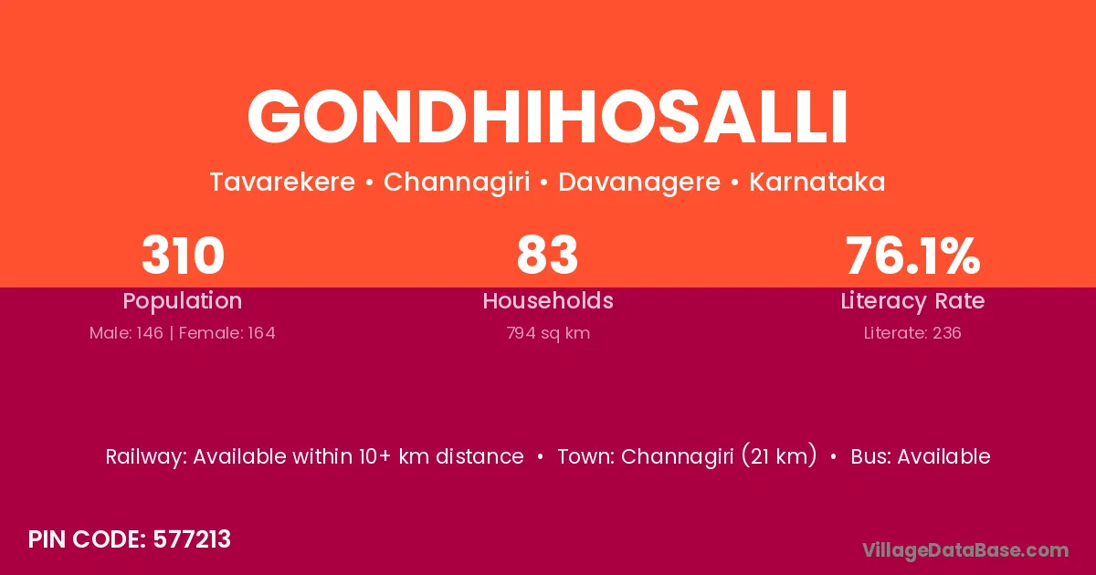 Channagiri (21 km) is the nearest town to Gondhihosalli village for major economic activities and is located approximately 21 km away.
