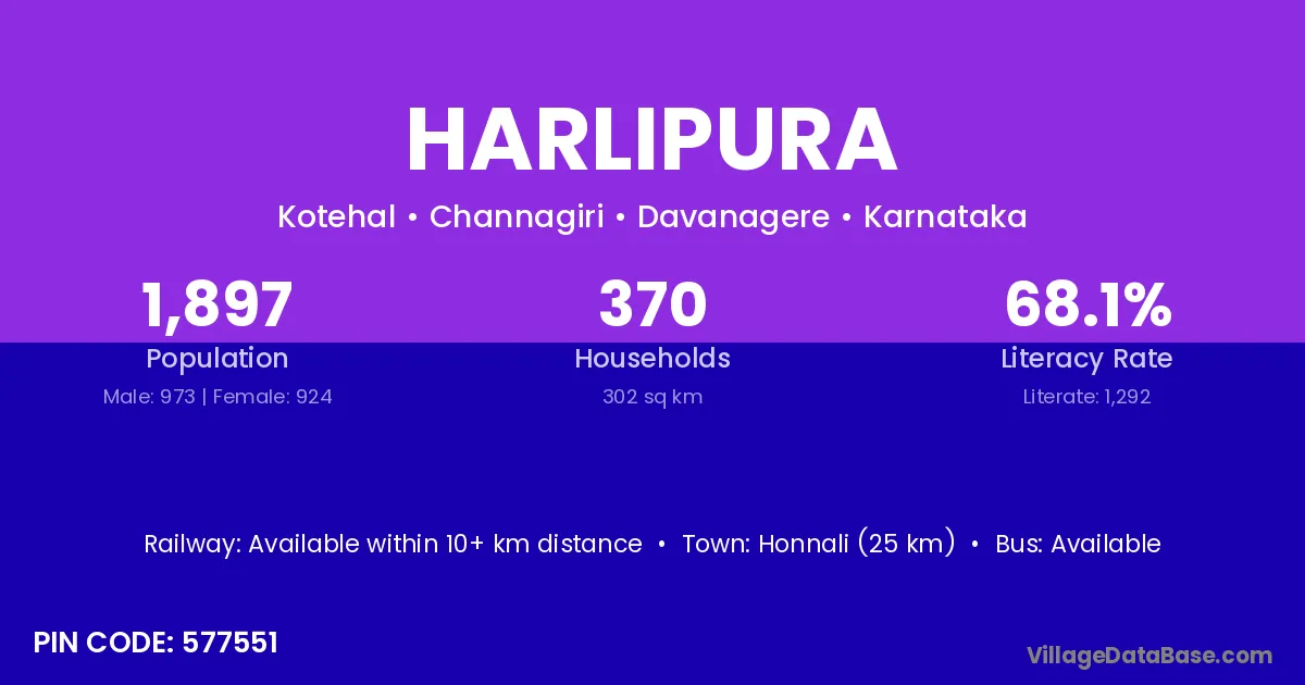Honnali (25 km) is the nearest town to Harlipura village for major economic activities and is located approximately 25 km away.