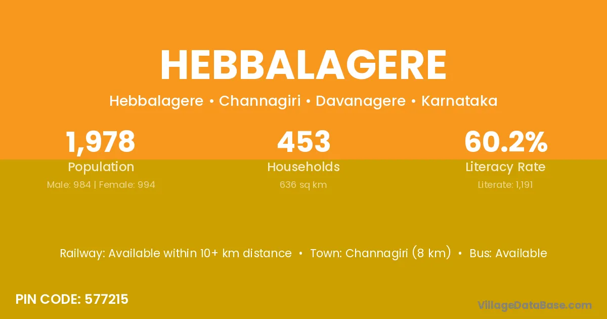 Channagiri (8 km) is the nearest town to Hebbalagere village for major economic activities and is located approximately 8 km away.