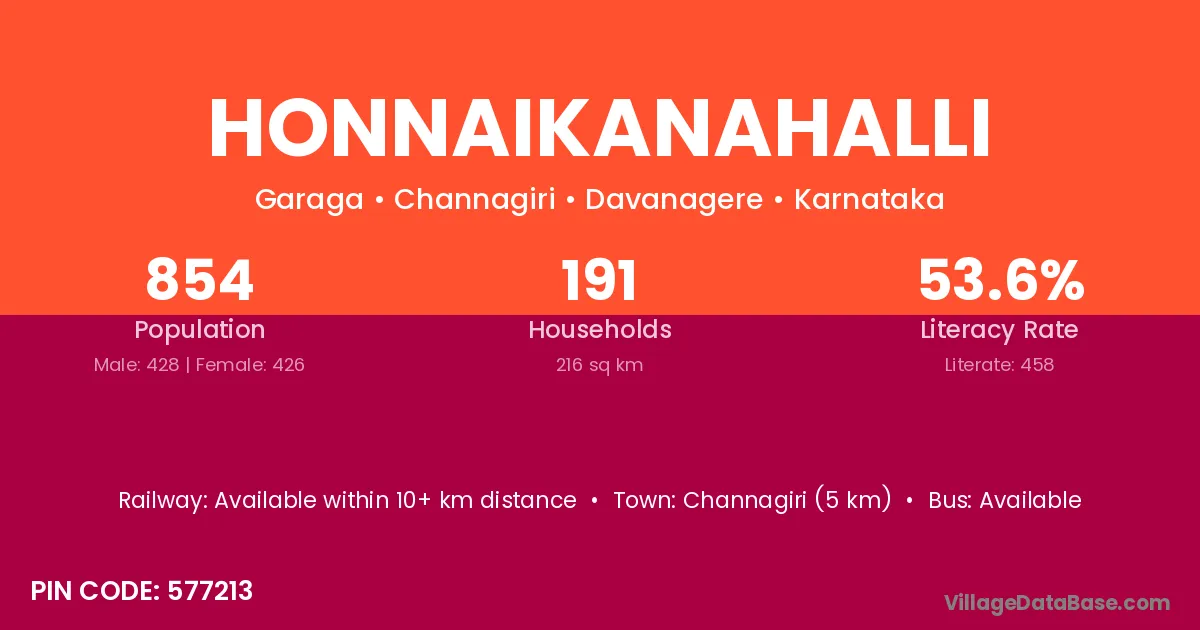 Honnaikanahalli village has a total population of 854 people, of which 428 are males and 426 are females.