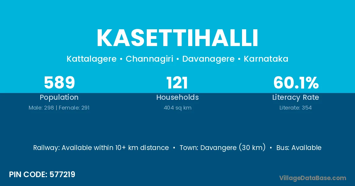 Davangere (30 km) is the nearest town to Kasettihalli village for major economic activities and is located approximately 30 km away.