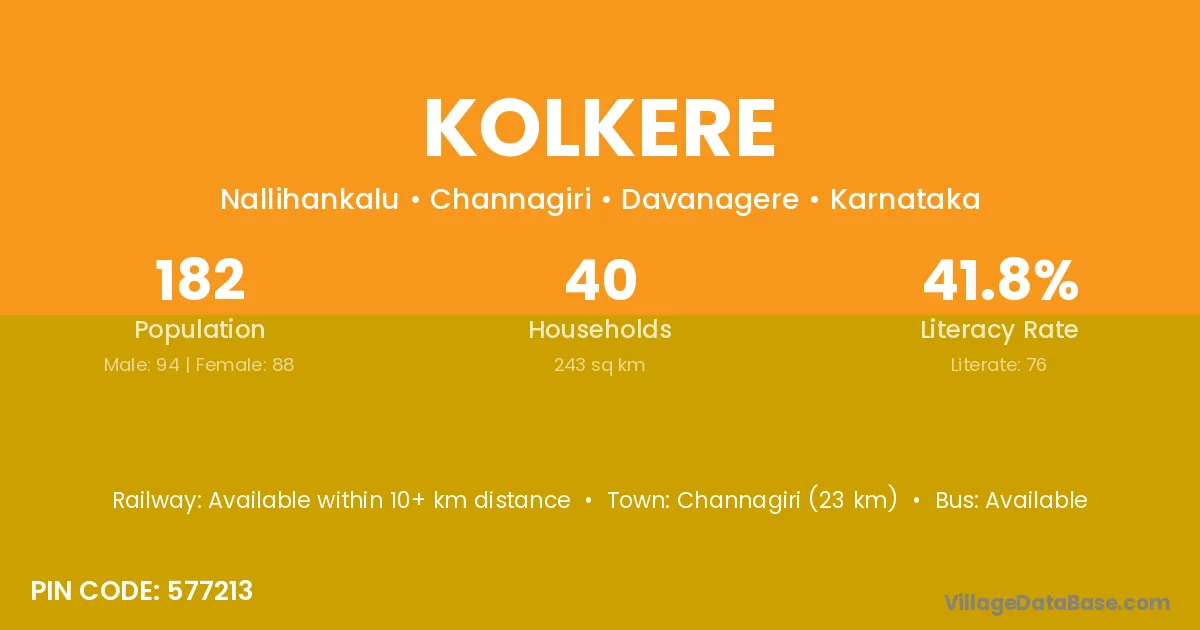 Channagiri (23 km) is the nearest town to Kolkere village for major economic activities and is located approximately 23 km away.